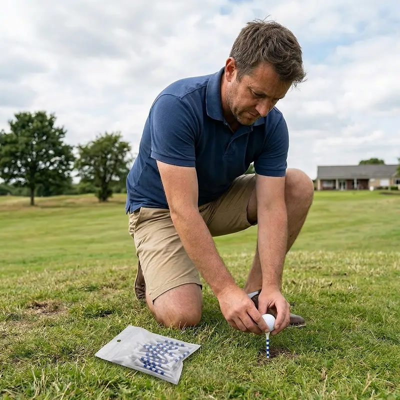 Uso le stesse poche tee ormai da settimane. Resistono alle mattine umide, entrano facilmente nel terreno duro e gli anelli colorati rendono il mio setup semplice e ripetibile.