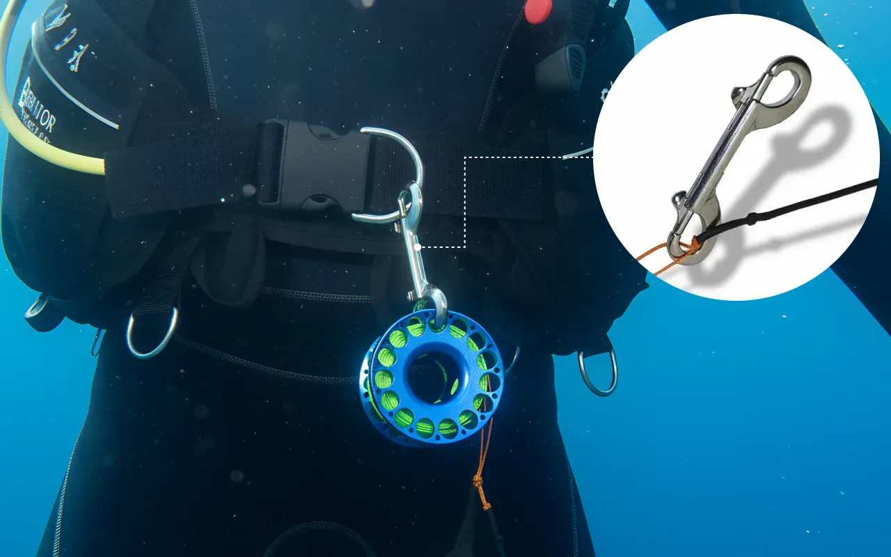 Il moschettone in acciaio inox si aggancia rapidamente al tuo D-ring. Nessuna difficoltà, così puoi concentrarti sulla tua avventura subacquea.