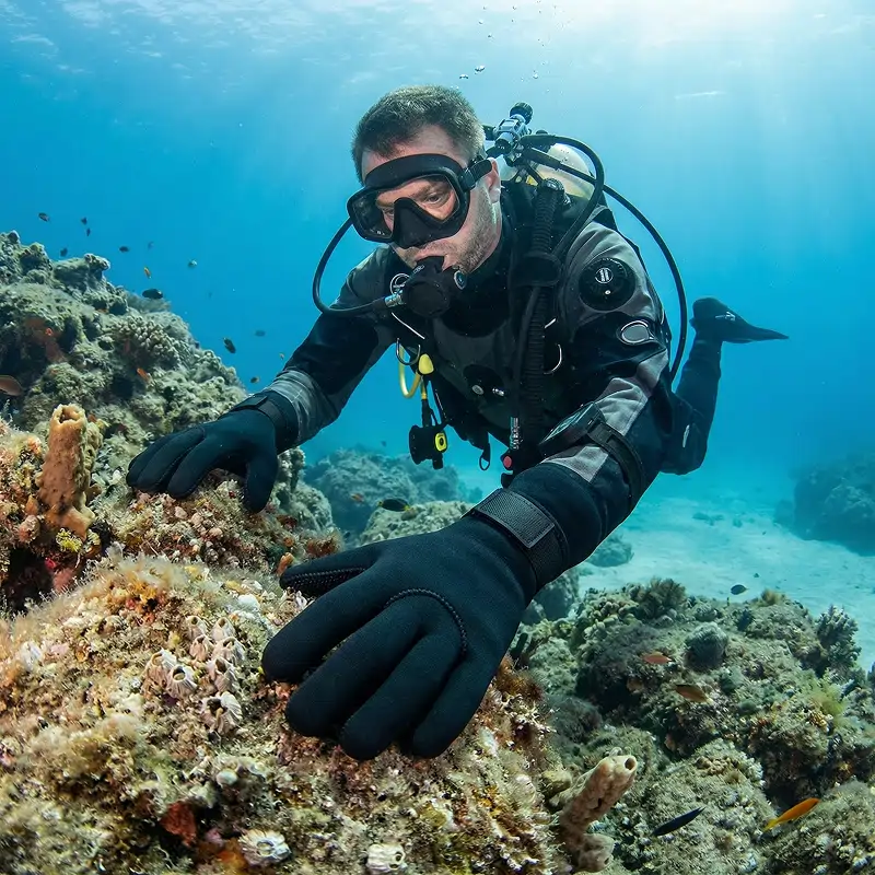 Buoni guanti per immersioni. Ho urtato contro un po’ di corallo, ma le mie mani erano completamente protette. Sono aderenti ma non stretti, perfetti sott’acqua.