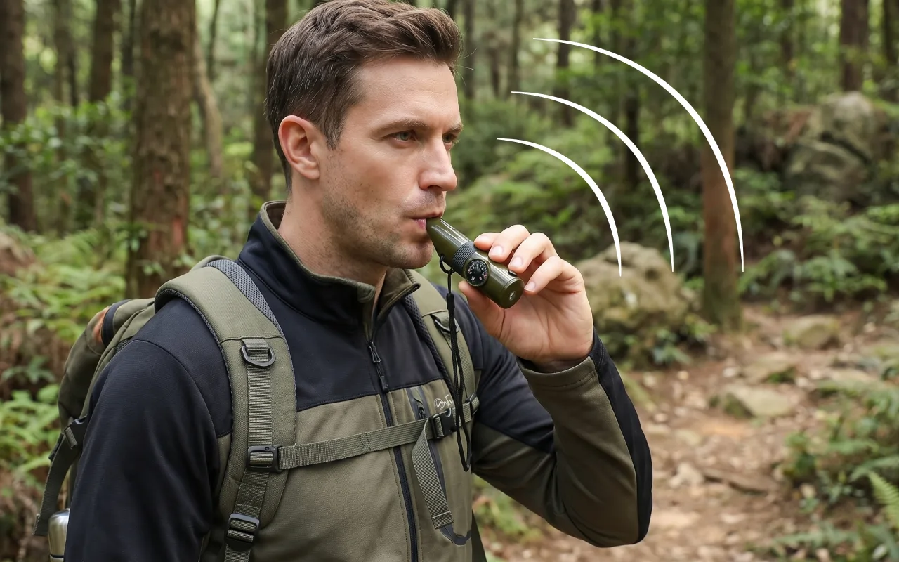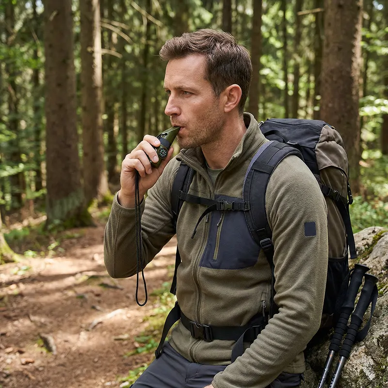 Aggancio il fischietto allo zaino quando cammino in montagna. È leggero, pratico e la luce di emergenza mi rassicura quando la nebbia arriva all’improvviso.