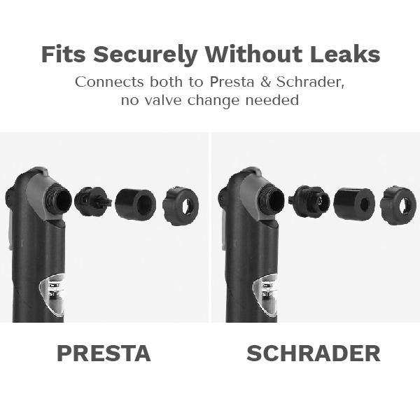 ✔️FACILE DA USARE — Non serve alcun tubo per collegarla alla gomma. Funziona sia con valvole Presta che Schrader: con una semplice rotazione della valvola (senza attrezzi) puoi adattarla a entrambi i tipi di pneumatici.