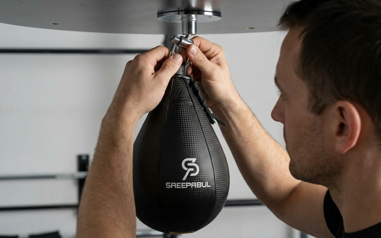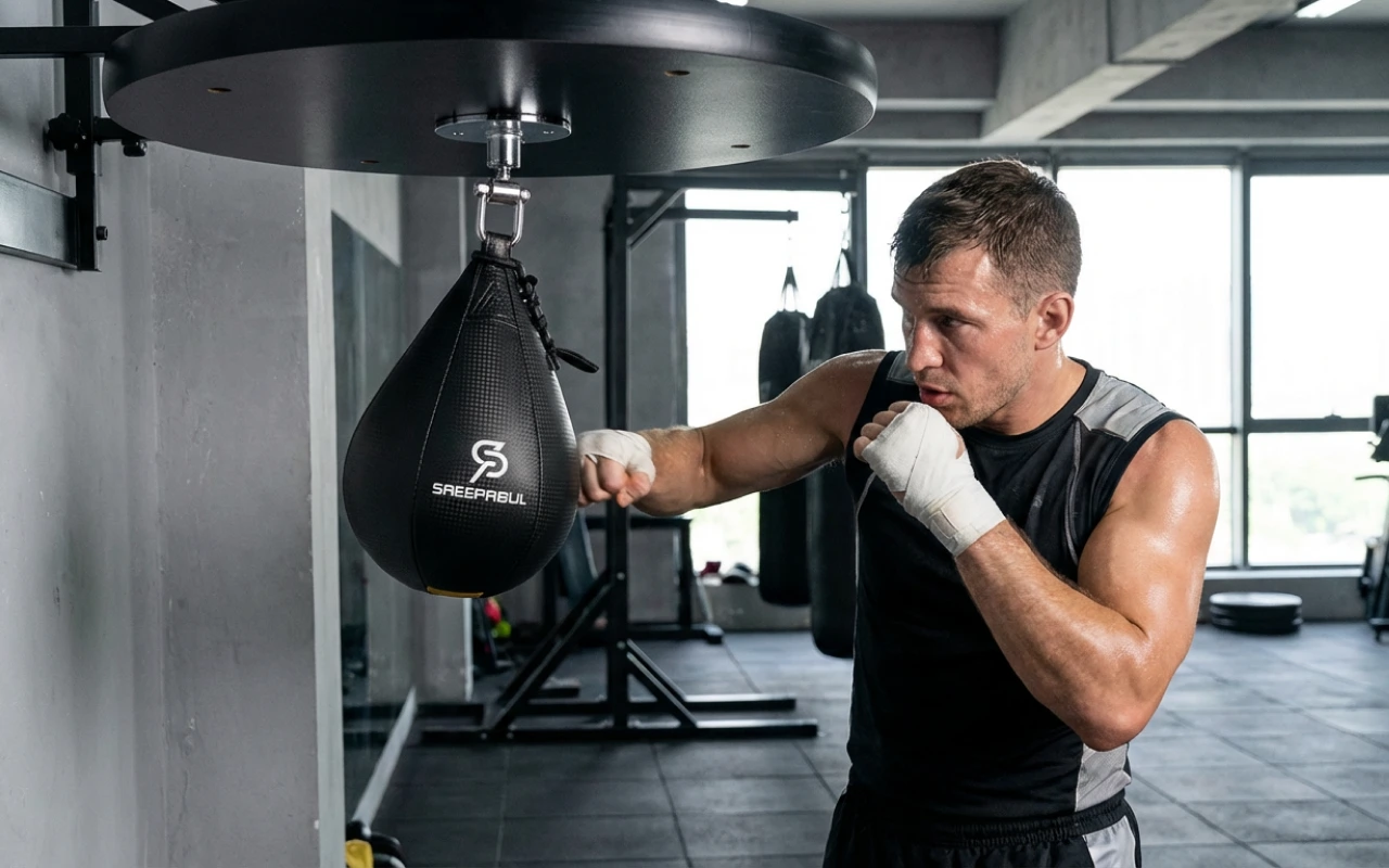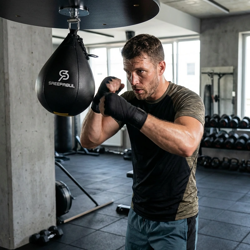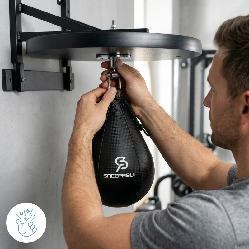 Appendo questa speed bag sopra la mia panca di casa. Il rimbalzo costante mi aiuta a mantenere un buon ritmo e il mio gioco di gambe segue naturalmente la cadenza.
