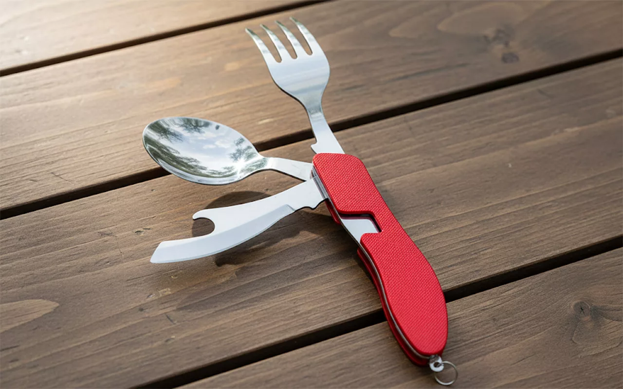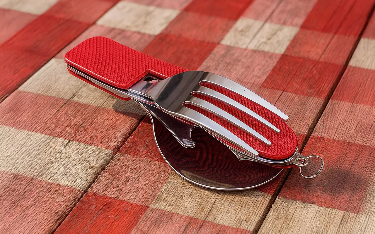 L'utensile da campeggio Threo ti permette di tagliare frutta e verdura, aprire lattine o bottiglie e mangiare con l'aiuto di una forchetta o un cucchiaio.