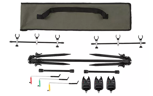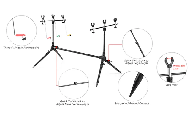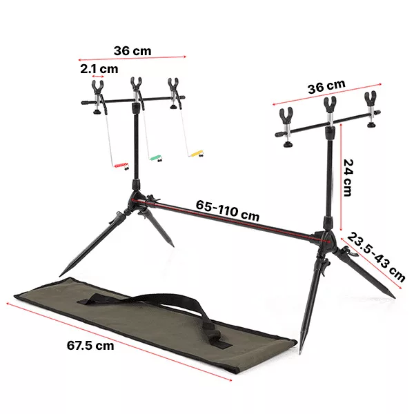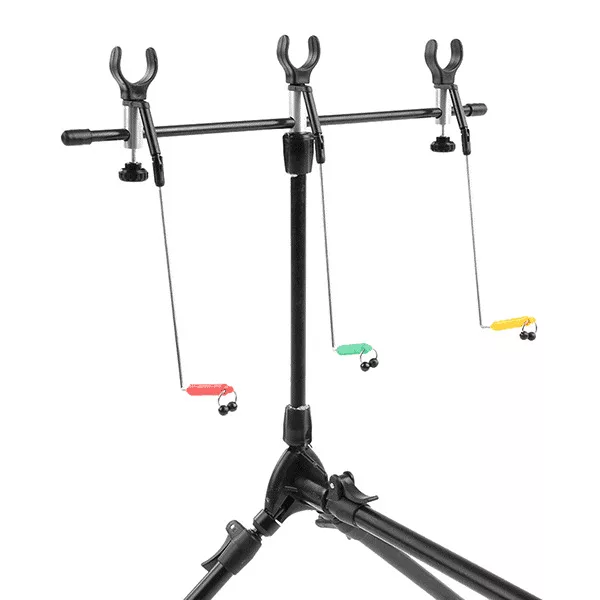 Successo in ogni ambiente di pesca. Il nostro rod pod è compatibile con allarmi morso e supporta fino a tre canne con sei poggia canne e tre oscillatori.