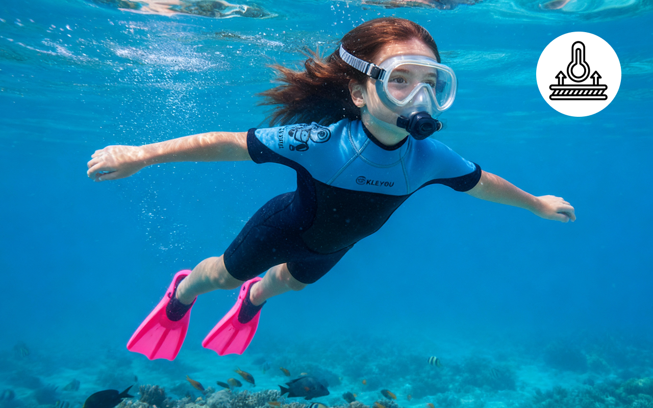 L’acqua fredda non è più un problema per i piccoli nuotatori attivi. Il tessuto speciale mantiene il calore vicino alla pelle, rendendo ogni attività piacevole.