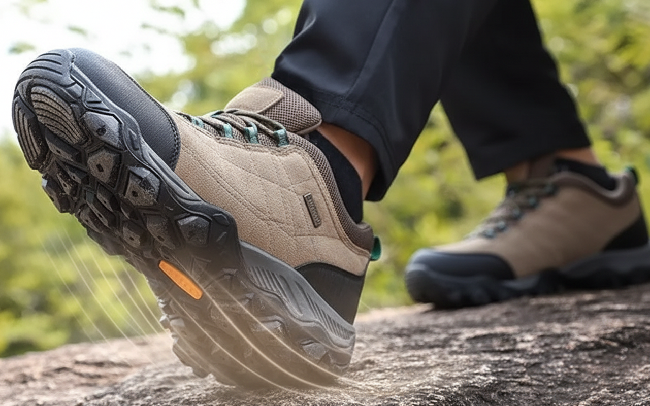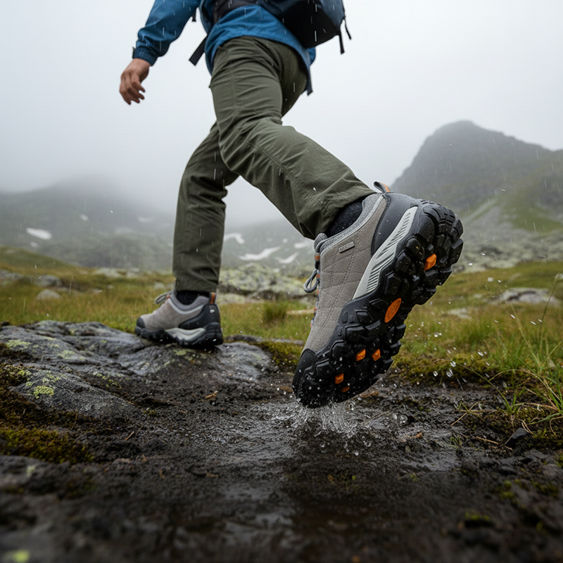 Le suole in gomma aderiscono saldamente su superfici bagnate o scivolose. Cammina sicuro su pietre, fango o erba con qualsiasi tempo.