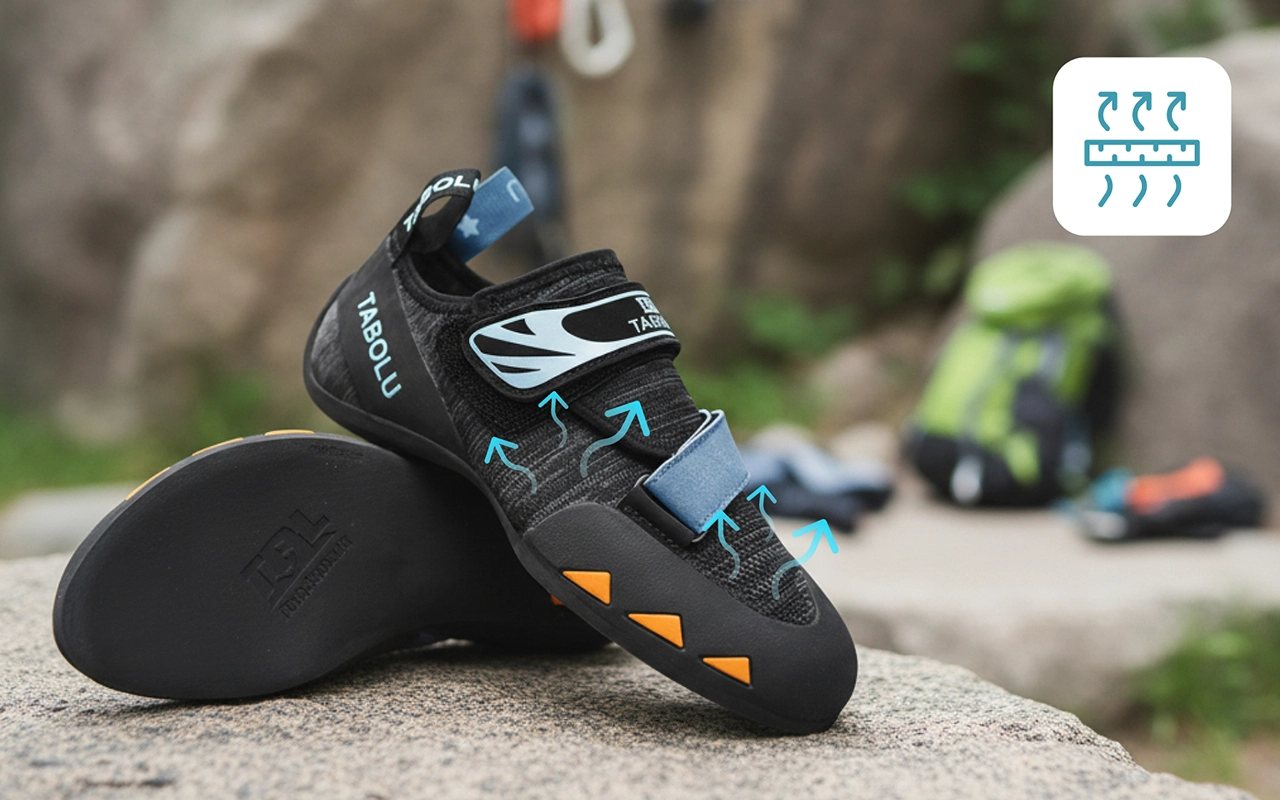 Con queste scarpe da boulder posso scalare con sicurezza. Sono facili da mettere e togliere, e i miei piedi restano freschi grazie ai pannelli in rete.