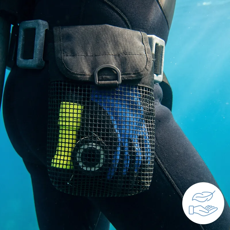 Sono un subacqueo alle prime armi e perdo continuamente le cose piccole. Questa sacchetta tiene insieme coltello, fischietto e lavagnetta, e l’acqua defluisce subito dopo ogni immersione.