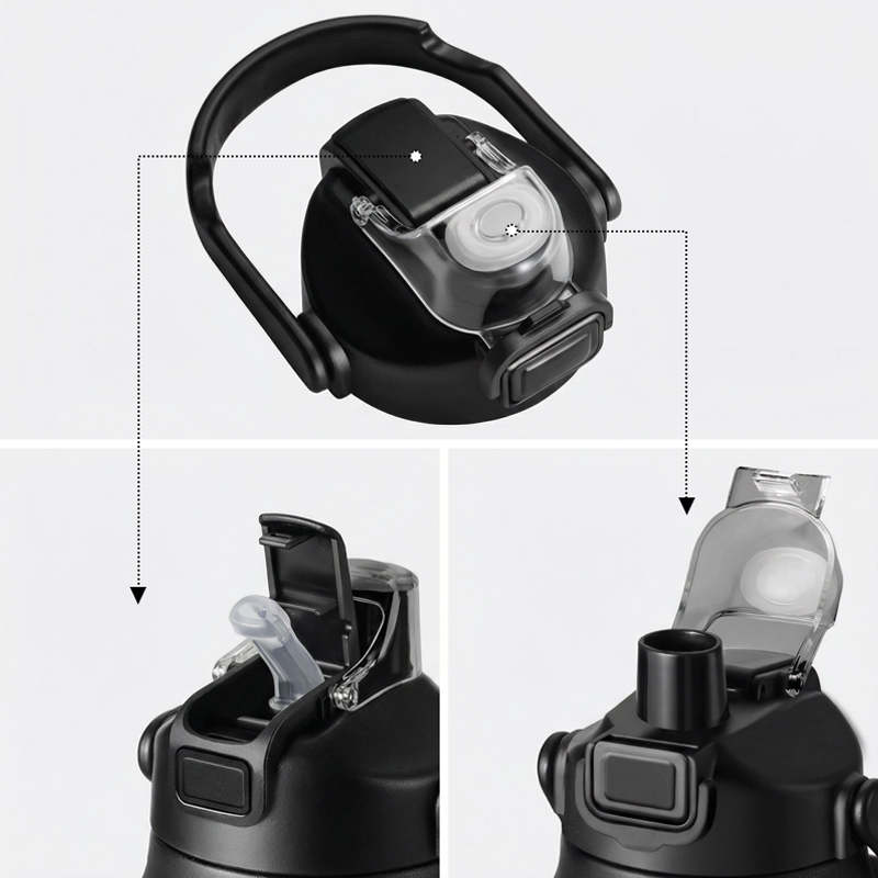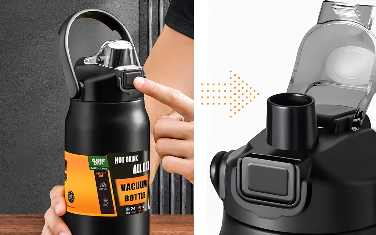 Un solo tocco apre il coperchio per bere subito. Il tappo a prova di perdite e il blocco di sicurezza evitano fuoriuscite nella borsa.