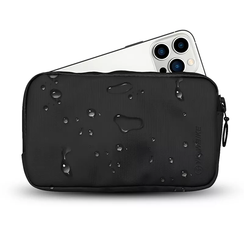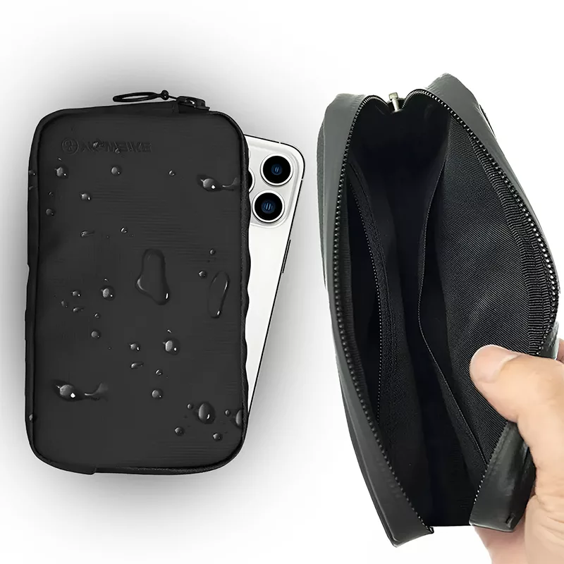Il mio telefono ci sta facilmente e ho ancora spazio per gli auricolari e il portafoglio. Nessuna acqua è entrata, nemmeno con gli schizzi.