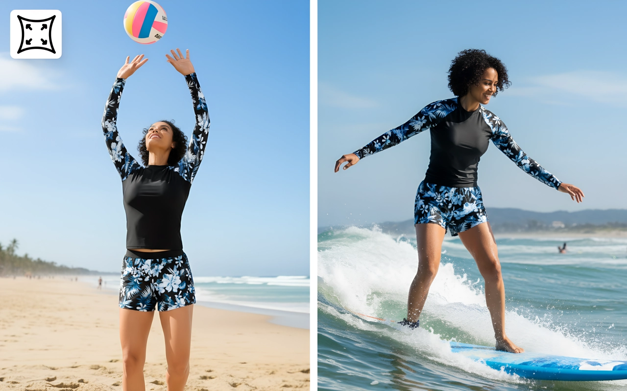 Maniche lunghe e pantaloncini aiutano a proteggere la pelle delicata dalle scottature. Goditi le tue attività senza pensieri mentre nuoti, fai surf o ti rilassi in piscina.