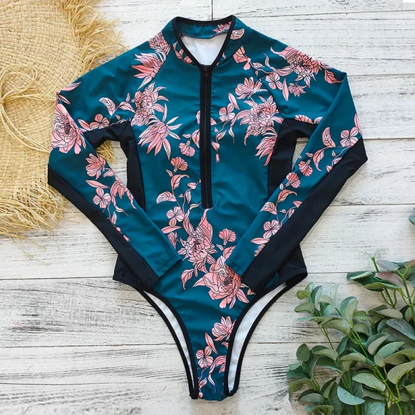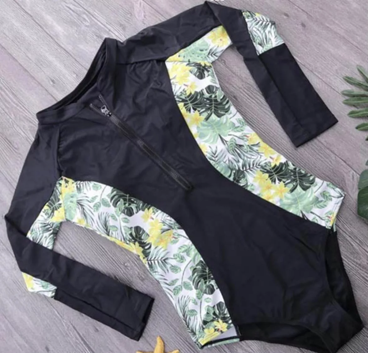 Sii completamente pronta a goderti le tue attività acquatiche — il costume THREO a maniche lunghe ti offrirà una copertura extra! Ti proteggerà dalle scottature solari offrendo al contempo una silhouette valorizzante. È realizzato in materiale ultra elastico per un movimento ottimale in acqua ed è pratico per copertura e protezione UV. Il nostro costume presenta un design elegante intero con stampe tropicali, rendendolo una scelta eccellente per allenamenti in piscina, nuoto, surf o immersioni.